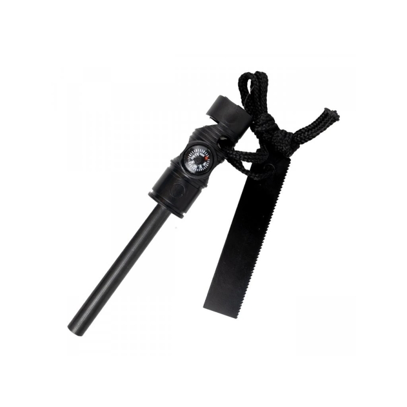 Pomůcka 3v1 pro přežití v přírodě. Křesadlo vyrábí velké jiskry a rychle zapálí suchou trávu nebo troud. Kompas se hodí pro orientaci v terénu a píšťalka pro přivolání pomoci. Před prvním použitím je nutné z tyčky škrtadlem seškrábat ochrannou černou vrstvu.