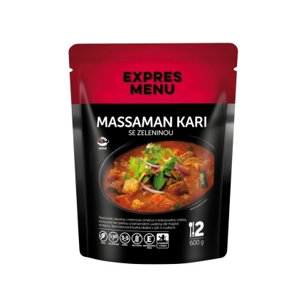 Složení: kokosové mléko (15%) (kokos, pitná voda), batáty (10%), mrkev (6,8%), květák (6,8%), červená cibule (6,8%), zelené fazolky (6,8%), arašídy, rostlinná směs plant mate SunbeanPRO (3%) (mouka ze sluneč. semínek, protein z bobu (Vicia Faba), hráškový protein), massaman kari pasta (2%) (chilli 20%, česnek, šalotka, jedlá sůl, citrónová tráva, kmín, koriandrová semena, galgán), sójová omáčka (1,8%) (pitná voda, sójové boby, jedlá sůl, ocet kvasný lihový), tamarindová pasta (1%) (Tamarind (96%), pitná voda, jedlá sůl), limetková šťáva, třtinový cukr, jedlá sůl, římský kmín, koriandr mletý, bobkový list