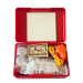 Sada obsahuje: zápalky, obvaz, náplasti, nůž, tužku, papír, 1m provázku, nit, jehlu, 2x zavírací špendlík, 3x gumička, 2x knoflíky, píšťalku, tuhý líh - 2 tablety, stahovací pásky, plastovou krabičku.