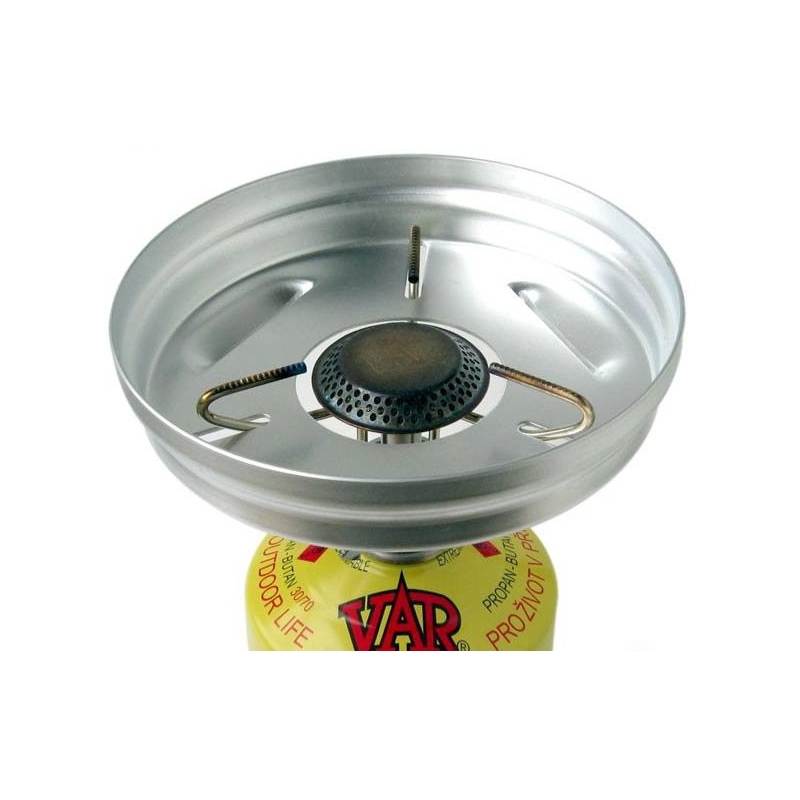 Závětří účinně chrání plamen před poryvy větru, velká reflexní plocha odráží veškeré teplo spalných plynů pod varnou nádobu.