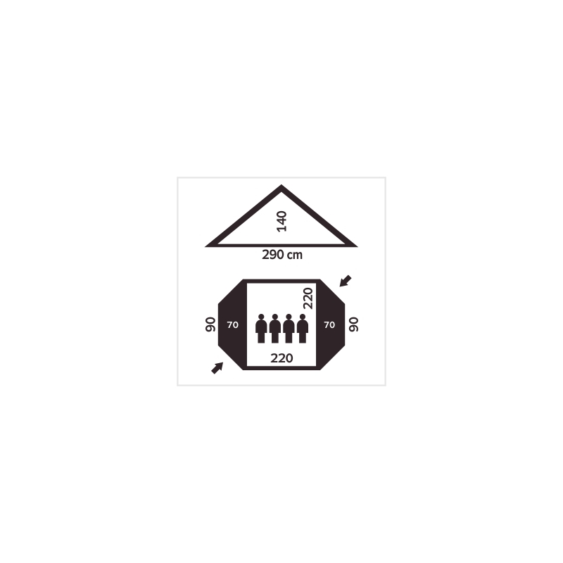 Stan pro 4 osoby. Jeho výhodou je prostornost a výška. Nabízí dvě rozměrné předsíně vhodné k vaření a uskladnění batohů.