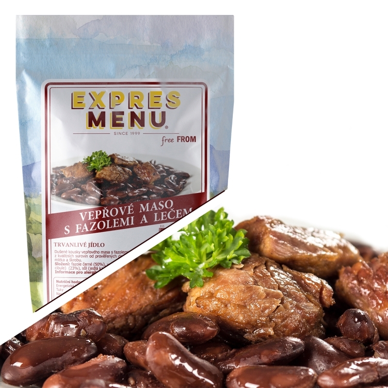 Složení: fazole černé (50 %), vepřové maso plec (25 %), lečo (rajčata, papriky, cibule) (23 %), sůl, pepř.