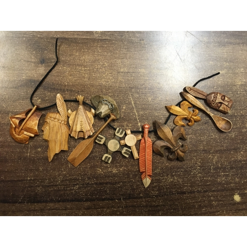 Dřevěný ručně vyřezávaný přívěsek. Je opatřen dírkou na provlečení kůžičky.