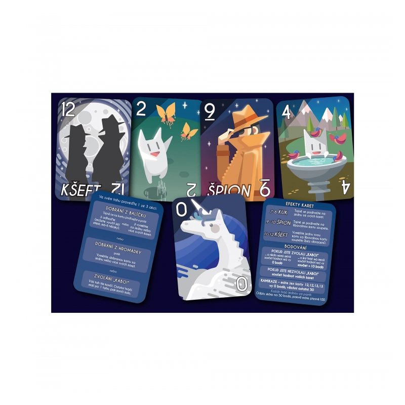 Nahlížejte, vyzvídejte a vyměňujte se soupeři karty ve snaze najít jednorožce Kaba! V této jednoduché a chytlavé hře vítězí hráč, jemuž zbydou karty nejmenších hodnot. Dokážete se zbavit vysokých karet rychleji než soupeři?