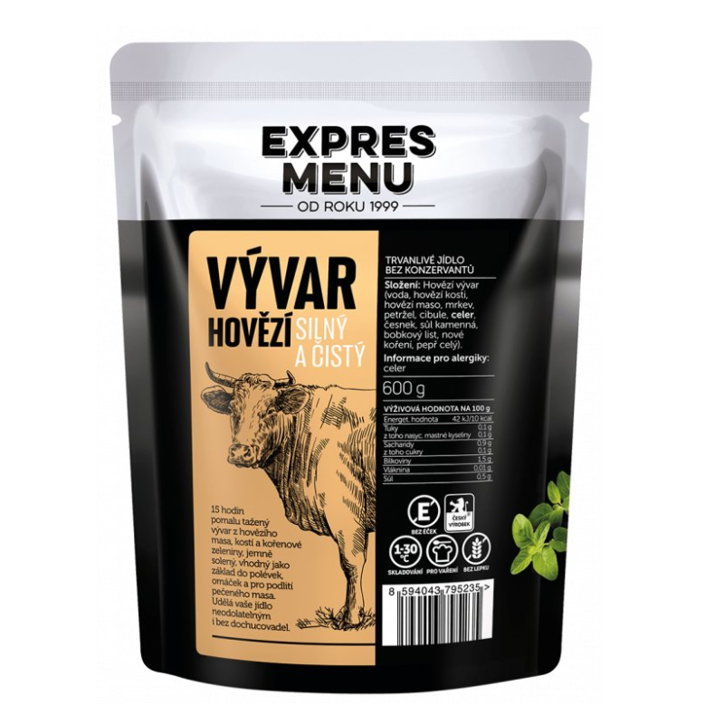 Složení: hovězí vývar (voda, hovězí kosti, hovězí maso, mrkev, petržel, cibule, celer, česnek, sůl kamenná, bobkový list, nové koření, pepř celý).