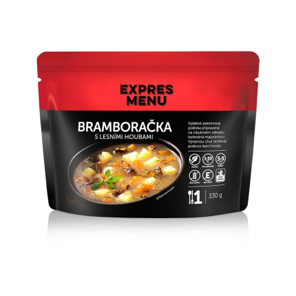 Složení: voda, brambory (8 %), směs polévkové zeleniny (mrkev, hrášek, květák, brokolice, kapusta, kedlubna), rýžová mouka, kukuřičná mouka, řepkový olej, cibule, sušené houby, česnek, sůl kamenná, majoránka, pepř, kmín