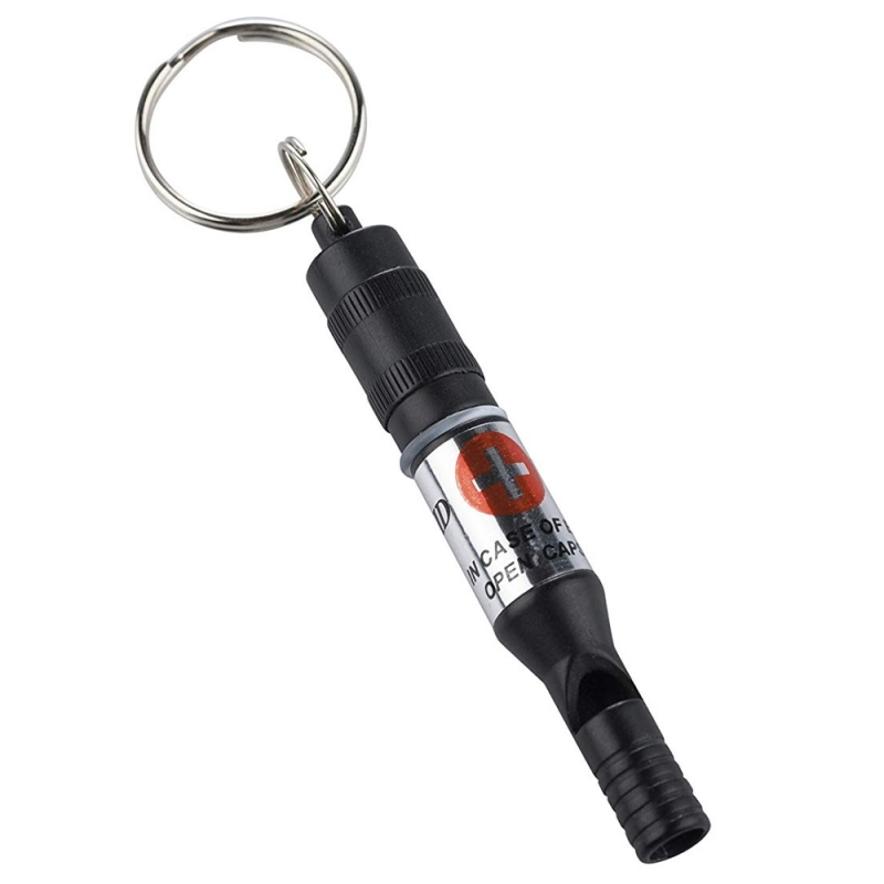 Pohotovostní píšťalka s voděodolnou kapslí k uschování například lístku s informacemi o majiteli.