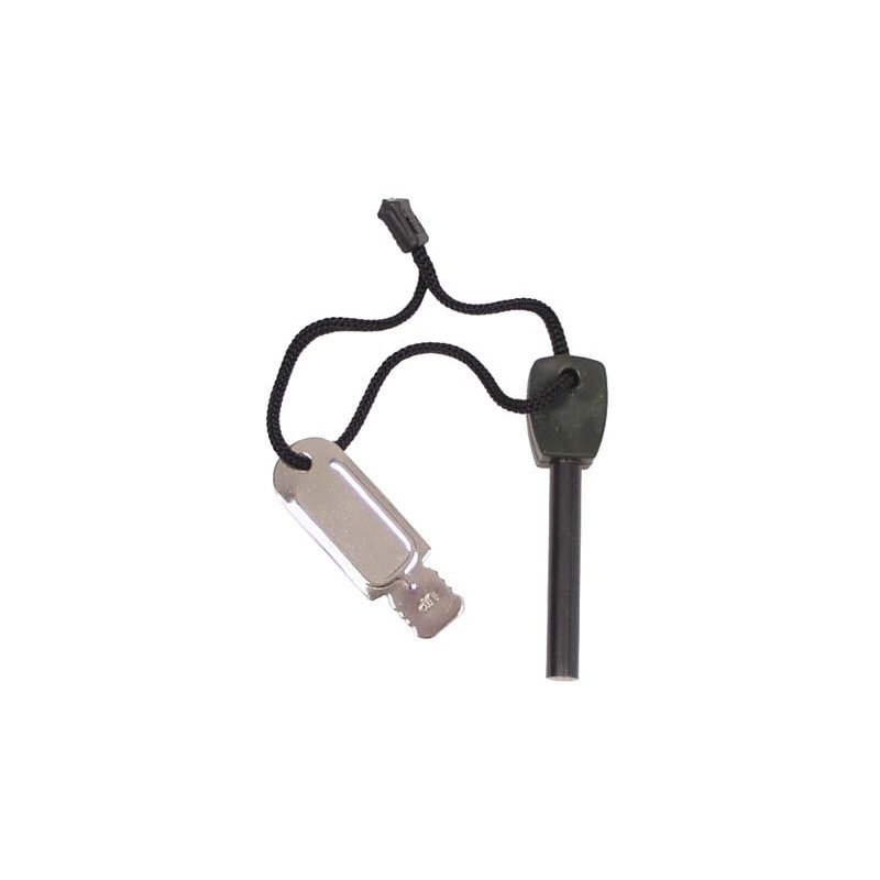 Křesadlo tvoří magnéziová tyčinka s plastovým držákem ve tvaru klíče navlečená společně s křesacím plíškem na černé nylonové tkanici.
