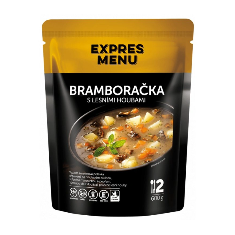 Složení: voda, brambory (8 %), směs polévkové zeleniny (mrkev, hrášek, květák, brokolice, kapusta, kedlubna), rýžová mouka, kukuřičná mouka, řepkový olej, cibule, sušené houby, česnek, sůl kamenná, majoránka, pepř, kmín
