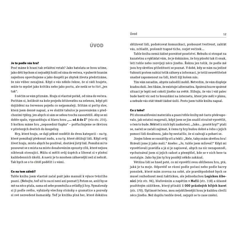 Kniha je plná her, které dokážou sbližovat lidi, podněcovat komunikaci, probouzet tvořivost, zahřát vás, zchladit, prolomit trapné ticho, rozjet večírek… Je to sbírka stovky tvořivých, zábavných, kooperativních her rozdělených podle situací, ve kterých byste je mohli využít. Jedete na dovolenou? Na to je tu jedna kapitola. Chcete s rodinou večer strávit trochu času společně? V knize najdete deset perfektních her ke stolu. Je víkend, ale venku lije jako z konve? Není problém. Uvízli jste v nekonečné koloně? Jenom klid. Máme řešení.