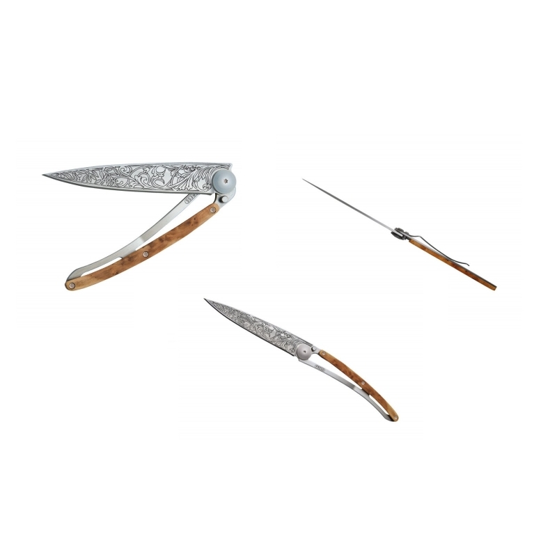 Ultralehká konstrukce, použití kvalitní francouzské nerezové oceli Z40C13 a precizní zpracování dělají z tohoto modelu Deejo ideální volbu pro milovníky designu, umění i praktických a spolehlivých kapesních nožů.