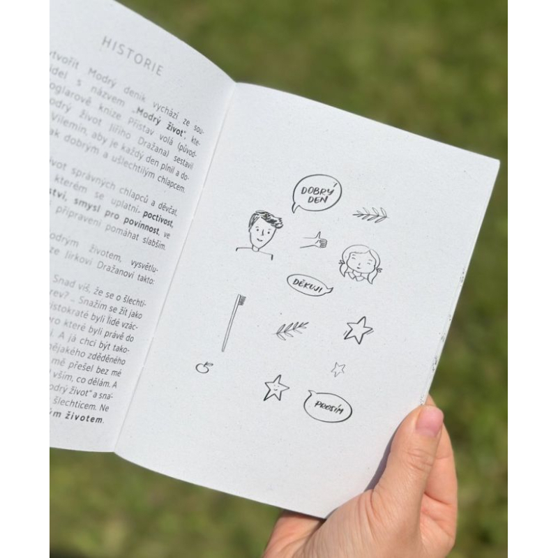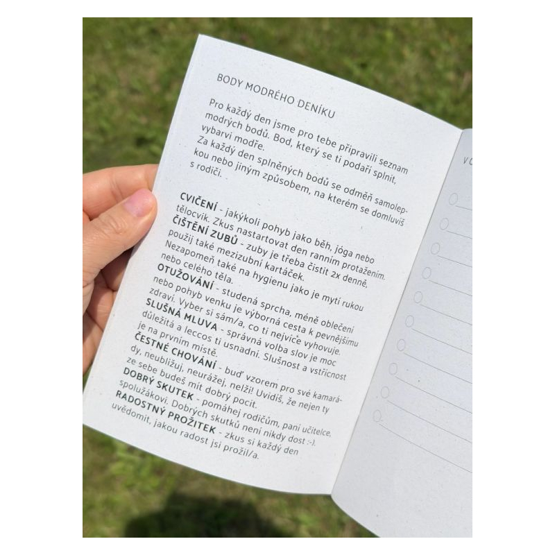 Modrý deník je praktická pomůcka hlavně pro děti zaměřená na rozvoj pozitivních návyků, jako jsou slušné chování, zodpovědnost a ohleduplnost. Prostřednictvím jednoduchých každodenních úkolů si děti upevňují důležité dovednosti a sledují svůj pokrok pomocí záznamů a samolepek. Deník obsahuje také měsíční výzvy, prostor pro osobní cíle i průběžné sebehodnocení.