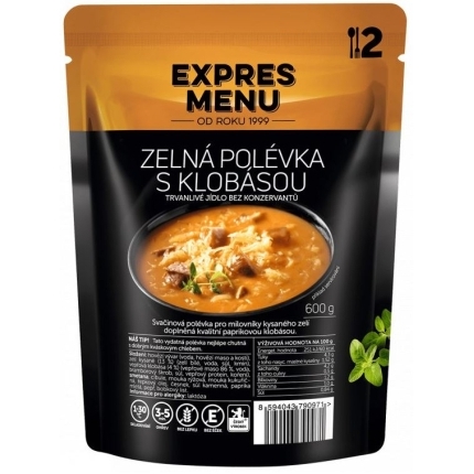 Složení: vepřová klobása (4 %) (vepřové maso, sůl, koření), zelí kysané (13 %) (zelí bílé, voda, kmín, sůl), pitná voda, smetana, cibule, kukuřičná mouka, rýžová mouka, sluneč. olej, česnek, sůl, paprika, bobkový list, pepř