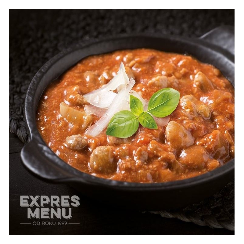 Složení: vepřové maso z plece (21 %), cibule, mouka rýžová, mouka kukuřičná, lečo (rajčata, paprika, cibule), slunečnicový olej, rajský protlak (rajčata, cukr, sůl), sůl, pepř, oregáno